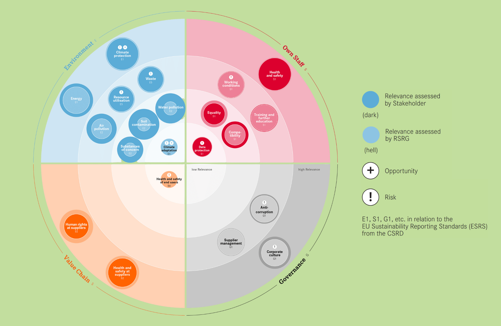 In summer 2024, RSRG conducted a double materiality analysis in accordance with the EU Corporate Sustainability Reporting Directive (CSRD). This process identified opportunities and risks in the field of sustainability and defined thematic areas to develop a sustainability strategy.
